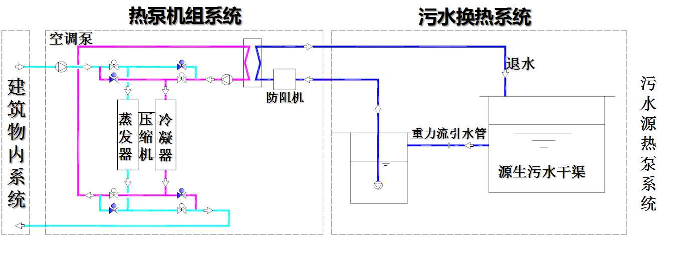 利用高效热泵机组回收市政污中水中的余热,为城市提供三联供服务(供热、制冷、生活热水)。