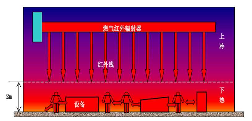 利用专用燃气装置产生类似于太阳光照的红外辐射热能,对建筑物供热,适用于高大空间厂房供热。