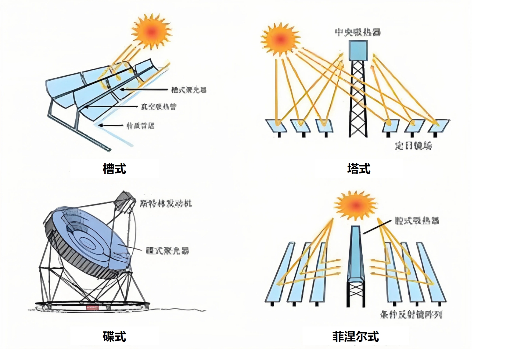 利用太阳能光热的三种技术(塔式、槽式、菲涅尔式),将太阳能转化为热能,用于供热或供应蒸汽,温度可达90℃—350℃。